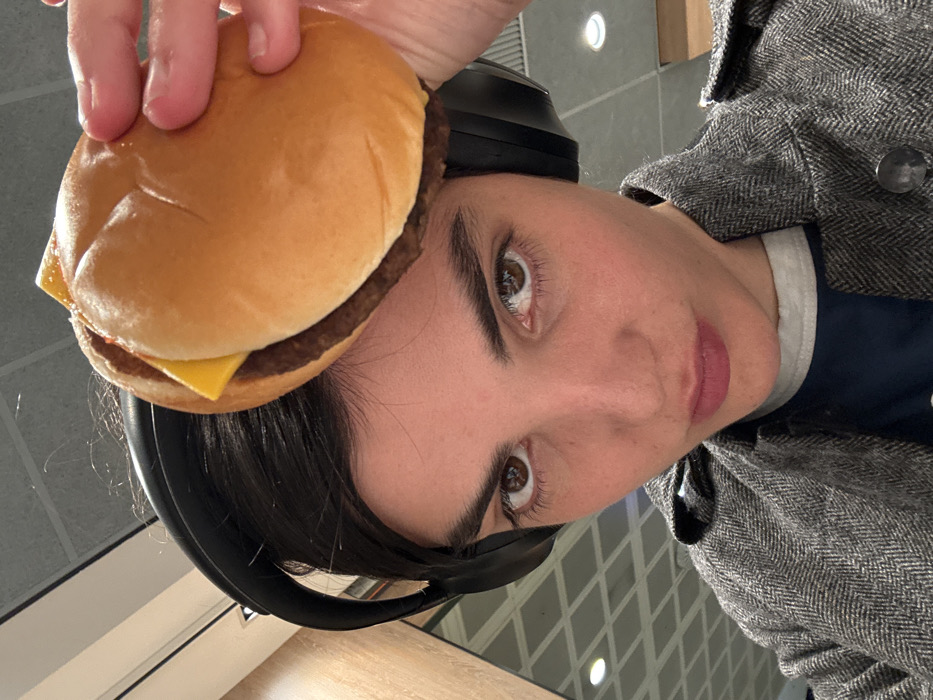- "A person holds a cheeseburger on their head, directly above their black headphones" by FM-kZ4ZN2, licensed under CC BY 4.0