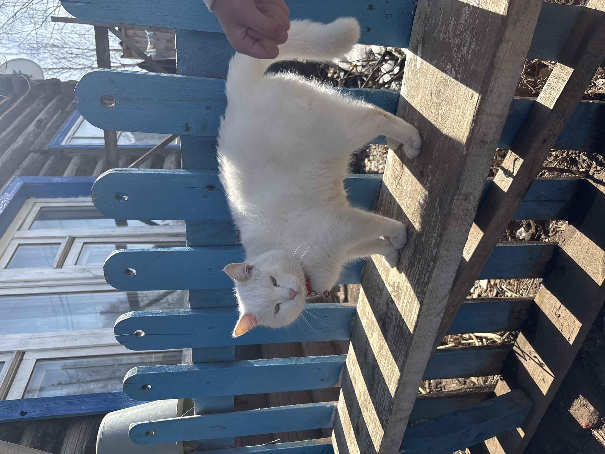 white cat with a red collar lying on a blue wooden fence and an adjacent wooden structure, possibly a bench. The setting appears to be outdoors, with a building visible in the background and sunlight casting shadows. The exact location in Osa, Russia cannot be determined from the image.