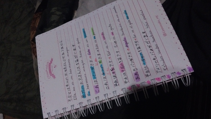 close-up of a notebook with handwritten notes and colorful highlights in Spanish and Japanese