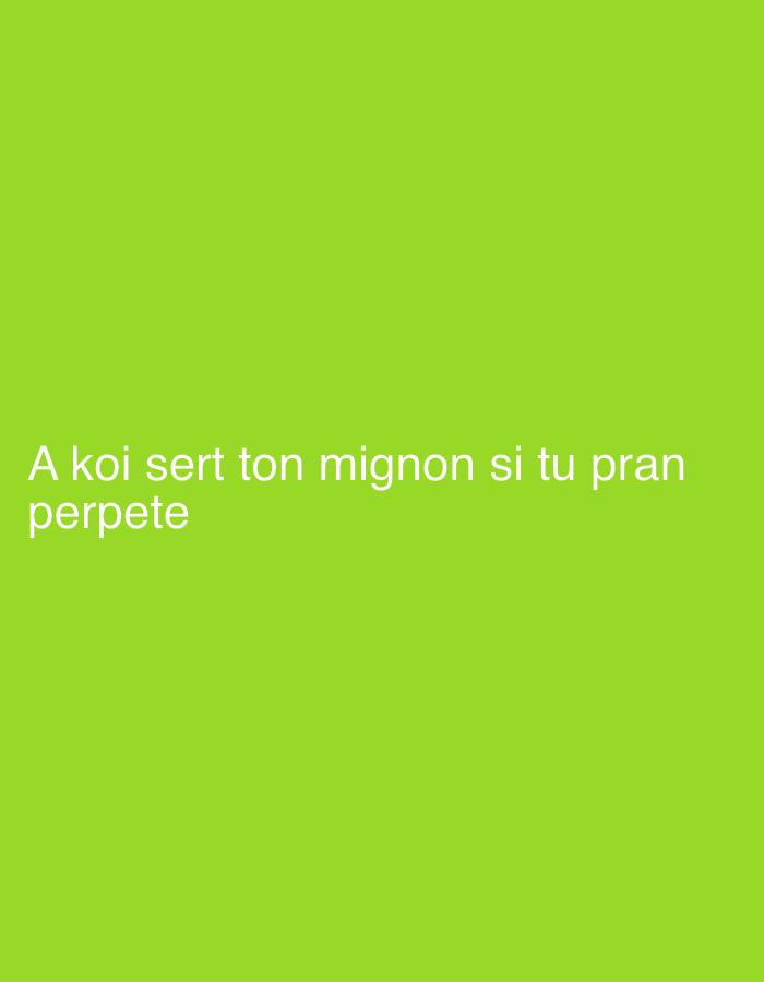 The image displays a lime green background with white text. The text reads "A koi sert ton mignon si tu pran perpete." This appears to be a phrase or question, possibly in French. The text is centered on the lower portion of the image, leaving ample empty space above.