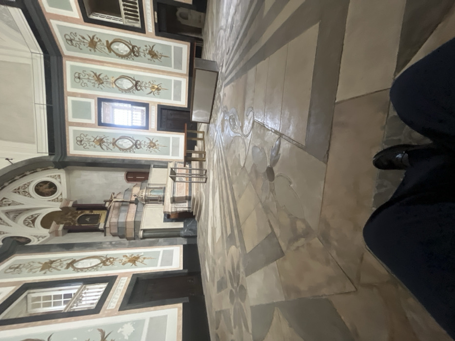 The image depicts the opulent interior of the Palácio da Bolsa (Stock Exchange Palace) in Porto, Portugal, specifically within the area of the Capela do Infante Dom Henrique. The perspective is a low-angle, first-person view, looking forward from a seated position. In the immediate foreground, the lower half of an individual's legs, clad in dark trousers, and a pair of black, formal slip-on shoes are visible. The floor beneath is composed of large, multi-toned stone tiles in shades of beige, grey, and brown, intricately inlaid to form geometric patterns and stylized floral motifs. The spacious room features high ceilings and ornate walls. The walls are segmented into panels with light blue-green fields, bordered by pinkish-peach and dark grey or black frames. These panels are richly decorated with gold gilt accents, including ribbons, wreaths, and oval-shaped framed elements, some appearing as portraits or mirrors. Multiple tall, rectangular windows with white frames are visible on both the left and right walls, admitting natural light. One window on the right includes a white balustrade. In the mid-ground, a long, rectangular display case with a light, reflective surface is positioned on the right. Centrally, a wooden table with thin legs is present, flanked by two clear or metallic framed display stands. Towards the rear of the room, an elevated, multi-tiered altar structure serves as a focal point. Constructed from light-colored stone with pinkish-grey striations, it features a smaller, ornate golden shrine or tabernacle on its lower level. Above this, a larger architectural element with arched sections and a circular depiction of a figure is visible. A solitary individual, wearing a light brown robe or garment, stands near the base of the altar steps on the left side, facing towards the altar.