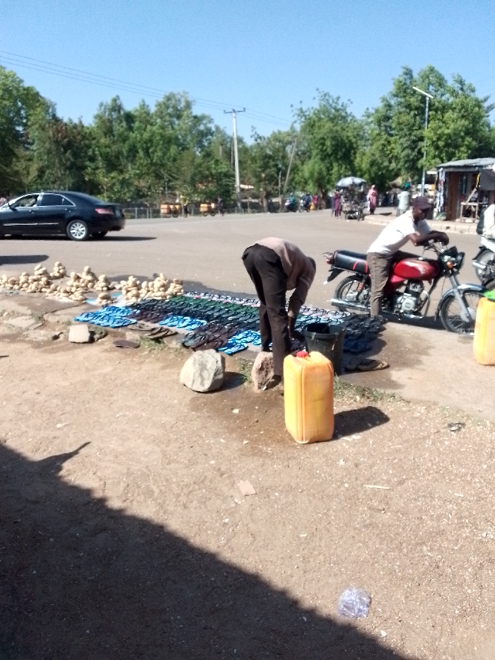 An outdoor market scene in Dabawa, Nigeria, is captured on a clear, sunny day. In the foreground, dirt and gravel ground is partially shaded by an unseen object to the left. A crumpled clear plastic wrapper lies on the ground in the lower right. To the left, a pile of numerous light-colored, irregular objects (resembling yams or similar produce) is displayed directly on the ground beside a paved road. A black sedan, possibly a Toyota Camry, travels from left to right on this paved road. In the center foreground, a male individual, dressed in dark trousers and a light-brown long-sleeved shirt, is bent over facing away from the camera. He appears to be arranging or tending to rows of multi-colored sandals and flip-flops laid out on a dark surface on the ground. Two large, light-colored rocks and a black bucket are situated near him. To his right, a yellow plastic jerrycan with a red cap stands upright. To the right, another male individual, wearing a light-colored short-sleeved shirt and a dark cap, stands leaning against a red motorcycle with a black seat. Part of a second motorcycle is visible further to the right. Beyond these motorcycles, a simple, dark-roofed structure with light-colored walls is visible. The background features a paved road extending into the distance, populated by additional vehicles and pedestrians. A dense line of green trees spans the mid-ground, interspersed with utility poles carrying power lines and a streetlight pole. The sky above is clear blue.
