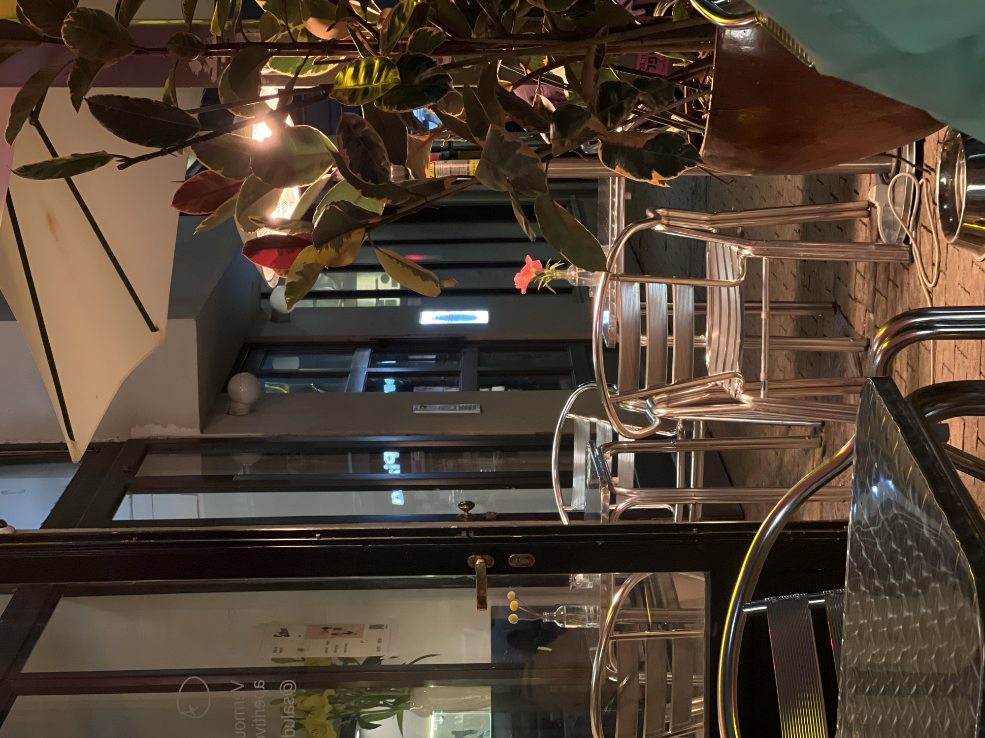 The image depicts an outdoor dining area, likely in Tel-Aviv, Israel. The scene is captured at night, with a focus on tables and chairs outside a building. The tables and chairs are predominantly made of aluminum, giving a modern, urban aesthetic. A potted plant with large leaves, likely a ficus or rubber plant, overhangs the tables, adding a touch of greenery to the scene. In the background, a building façade with glass doors and windows is visible, reflecting interior lighting. A flower in a vase sits on one of the tables. The image suggests a casual, nighttime dining atmosphere in a city environment. The area is paved.