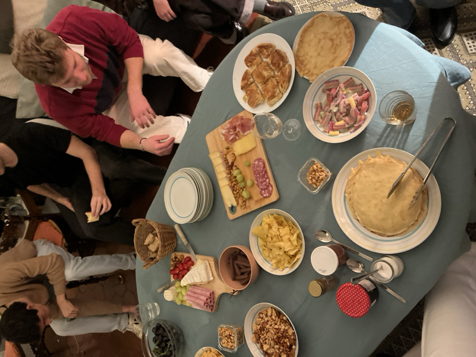 A top-down view captures a gathering around a round table covered with a light blue cloth. Various food items are displayed, including stacked crepes with serving tongs, a puff pastry, a bowl of colorful candy, chips, nuts, charcuterie boards with cheeses, meats, and grapes, and open jars. The table is surrounded by people casually dressed, adding to the informal atmosphere.