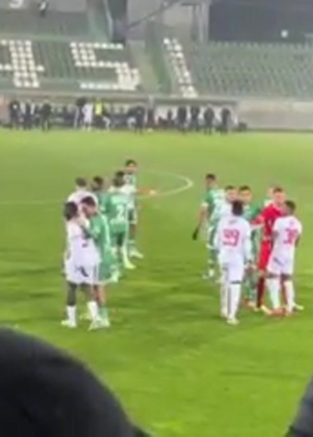 A wide-angle shot shows a soccer match. On the green field, soccer players in green and white uniforms and in red and white uniforms confront each other at midfield, appearing to argue. The referee, in black and neon green, is on the field as well. A spectator is in the foreground in the lower center. The stadium, with green seats, is visible in the background. The word “LUDOGORETS” is written on the upper deck of the stadium. A few people can be seen in the stands. The field is wet and reflecting light. The crowd is heard chanting in the background.