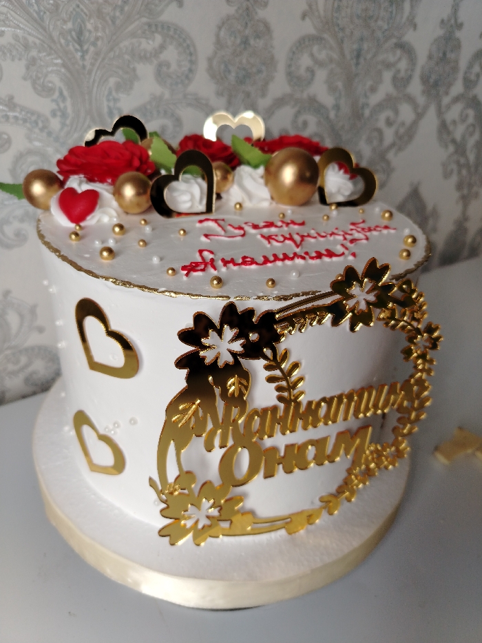 A round, white frosted cake is decorated with gold accents. The top features red roses, green leaves, white meringue swirls, gold spheres, and black heart shapes. The sides are embellished with gold heart cutouts and a gold floral wreath surrounding Cyrillic lettering. The inscription on top is written in red icing. The cake sits on a slightly larger, white-covered base.