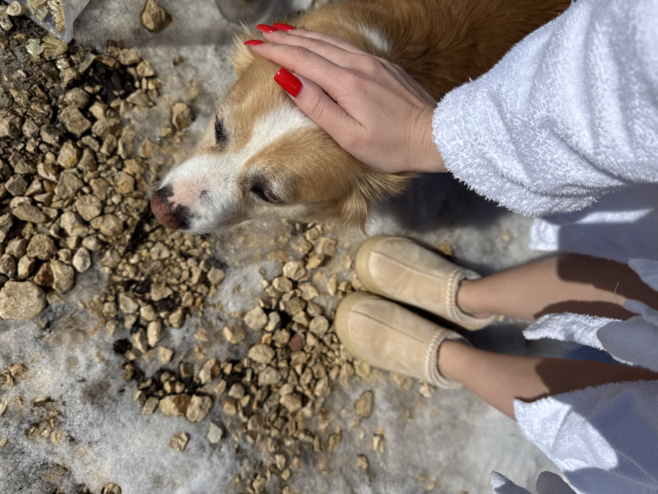 An overhead perspective captures a scene in Motički gaj, Montenegro, featuring a person and a dog on a mixed ground of snow, ice, and light brown gravel. The person's bare lower legs, feet in beige Ugg-style slippers, and right arm encased in a white terrycloth bathrobe are visible. The person's right hand, adorned with bright red manicured nails, is shown gently petting the head and neck of a light brown and white dog. The dog's head is tilted upwards, eyes closed, appearing to enjoy the interaction. The environment is brightly illuminated by direct sunlight, casting distinct shadows from the person's legs and bathrobe onto the ground.