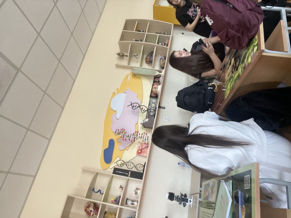 The scene depicts the interior of a classroom or laboratory, likely in a school in Panagyurishte, Bulgaria. The room has light-colored walls and a white grid ceiling. Along the main wall, two light wooden shelving units display various scientific models and equipment, including a red anatomical head, a blue abstract shape, cylindrical containers, and multiple microscopes. Between the shelving units, a large yellow wall mural features abstract biological shapes in blue, pink, and light blue, along with prominent 3D models of DNA double helixes. Below the right shelving unit, anatomical models, possibly of internal organs, are visible. Three young females are present. In the foreground on the left, a female with long, straight dark brown hair is seated with her back to the camera, wearing a white long-sleeved top and light-colored pants. She is positioned at a light-colored wooden desk which holds a green spiral-bound notebook, a blue mobile phone, and a microscope. A clear water bottle stands behind her. To her right, a second female with long, dark brown hair is seated at a wooden desk with a green-patterned top. She wears a dark t-shirt, holds a mobile phone in her hands, and appears to be smiling or speaking. A black backpack rests on the desk or chair beside her. Further to the right, a third female with dark hair is partially visible, standing or leaning behind a desk, wearing a dark t-shirt with a graphic design. A maroon backpack is on the desk in front of her.