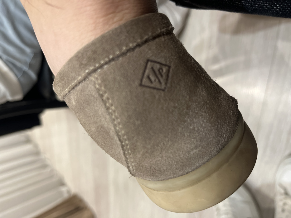 A close-up image depicts a person's right foot wearing a light brown/taupe suede shoe