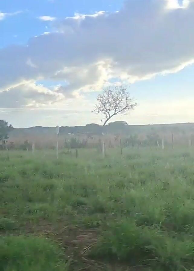The camera moves from left to right while looking at a grassy field bordered by a fence