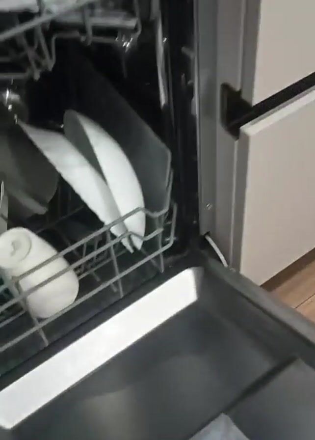 inside of a dishwasher. The dishwasher is partially filled with various dishes including plates, bowls, mugs, and a metal pot. The dishwasher is a modern style with a stainless steel interior. A hand is seen gently shaking the upper rack, causing the dishes to slide and shift within the rack. The environment appears to be a modern kitchen.