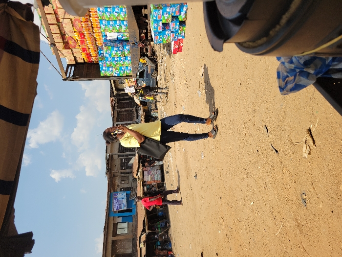 The image depicts an outdoor market scene in Onitsha, Nigeria, under a bright, partly cloudy sky