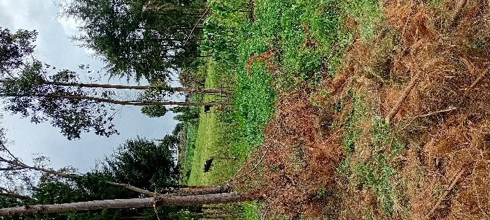 The image depicts a rural landscape in Kinale ward, Kenya, under an overcast sky. The foreground features a substantial area of disturbed ground covered in dried, brown plant debris, cut branches, and sparse green grass, indicating recent vegetation clearing. In the midground, a vibrant green field is visible, populated by two dark-colored domestic animals, likely cattle, positioned grazing or standing. Several tall, slender trees with light bark, possibly Eucalyptus, rise from the midground and extend into the background, interspersed with denser green foliage and smaller cultivated plants, potentially maize, on the right. The background consists of gently sloping green hills sparsely dotted with trees, and faint structures are discernible on the distant horizon. No human figures are present.