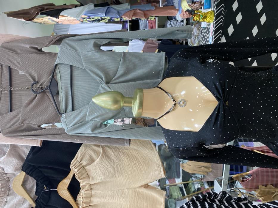 The scene depicts a retail clothing display inside a commercial establishment, likely within a fashion gallery or store in the Once neighborhood of Buenos Aires, Argentina. In the immediate foreground, a light-skinned mannequin torso wears a long-sleeved black top, possibly a dress, featuring a V-neckline, a twisted knot design at the bust, and iridescent white sparkle embellishments scattered across its surface. A black choker necklace with silver beads and a circular silver pendant containing a central pearl and small surrounding stones is also worn by the mannequin. Directly behind the mannequin, a long-sleeved sage green crop top, identical in design with a V-neck, twisted knot, and subtle sparkle, hangs on a black plastic hanger. Above and behind the sage green top, a similar taupe-colored long-sleeved crop top is displayed on another black plastic hanger, connected by a silver chain. To the left, a pair of black loose-fitting shorts hangs from a wooden hanger, and below them, a pair of light beige crinkled shorts with an elastic waistband and pockets is suspended on another wooden hanger. The background reveals densely packed clothing racks and shelves holding various folded and hung garments of different colors. A golden Maneki-neko (lucky cat) figurine is visible on a black and white patterned surface in the lower right background. No individuals are present in the image.
