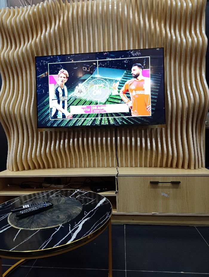 An interior scene depicts a modern entertainment setup, likely in a living room. A large, wall-mounted flat-screen television is centered on a light-colored wooden feature wall composed of numerous vertical, undulating slats that create a wave-like texture. The television displays a graphic preview for a football match, featuring a player in a black and white striped jersey on the left and a player in an orange jersey on the right, overlaid on a stadium background. Text on the screen reads "NEWCASTLE 28 AUG 21:00 QAT." Below the television, a light-wood media console is visible. Its left side features an open shelf containing electronic devices and visible cables. The right side has a closed cabinet door with a horizontal dark handle, exhibiting some adhesive residue or markings. In the foreground, a round coffee table with a black faux-marble top, white veining, and a central dark, textured circular inset is present. The table has a gold-colored rim and legs. Two black remote controls rest on the table's central inset. The floor is dark-tiled. No individuals are present, and no actions are depicted. The specific location within the city of Nairobi, Kenya, cannot be determined from the visual information provided.
