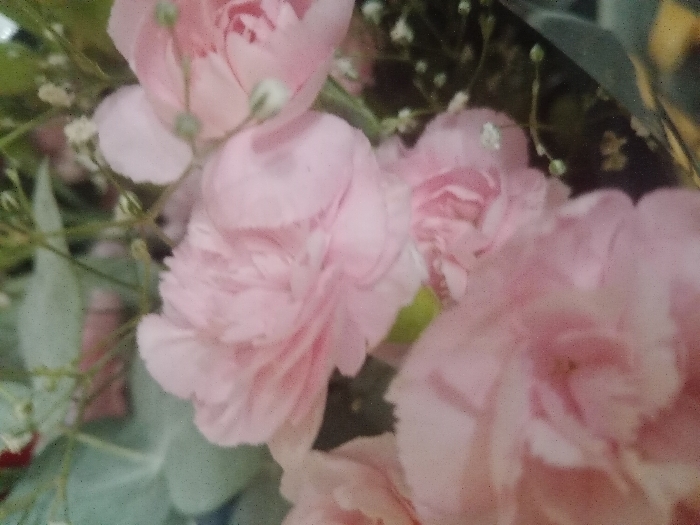 A cluster of pale pink carnations, their ruffled petals densely packed, fills the frame. Delicate sprigs of baby's breath, with tiny white blossoms, intertwine among the carnations. A few muted green leaves add texture to the background. The overall effect is soft and romantic, suggesting a bouquet or floral arrangement. The image has a slightly blurred quality, giving it a dreamlike feel.