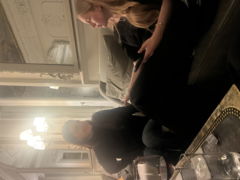 Two women are seated in a room featuring ornate decor, including a chandelier and decorative molding. The woman on the right has blonde hair and is wearing a black top. The woman on the left has long brown hair, also wearing a black top. A tray with wine glasses is visible in the foreground. The room appears to have large windows letting in some light.