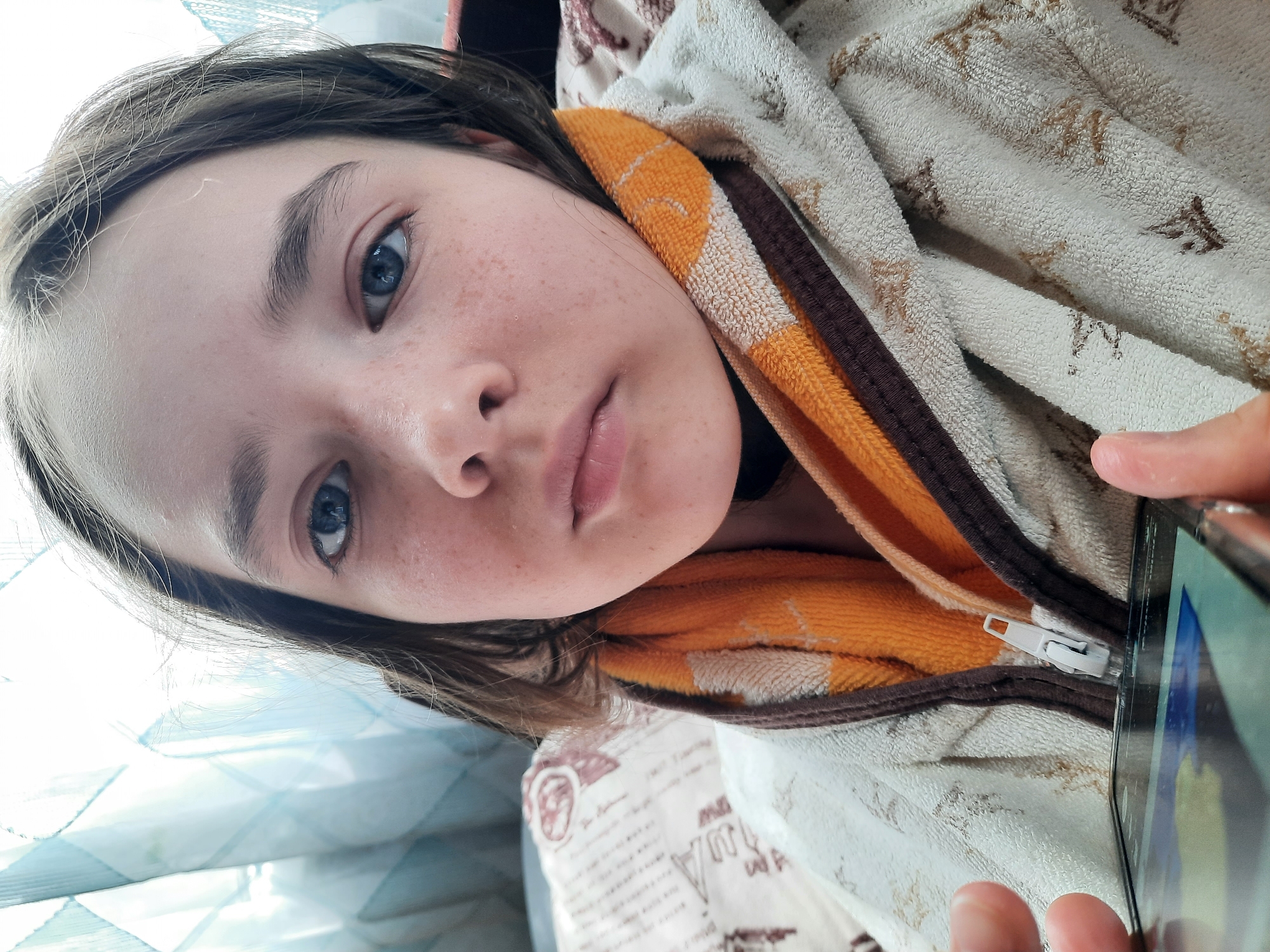 A close-up, indoor portrait photograph captures a young individual with light skin, blue eyes, and medium-brown hair, exhibiting numerous freckles on the face. The individual is looking directly at the camera with a neutral expression. They are wearing a light-colored, possibly off-white, terry cloth hooded garment featuring a repeating light brown pattern, with an inner collar and hood lining composed of orange and white striped terry cloth and dark brown trim around the zipper. A light grey plastic zipper pull is visible. The individual's left hand is partially visible in the lower left foreground, holding a smartphone or similar electronic device displaying a screen with predominantly blue and light blue tones. In the background, a translucent, light blue curtain with a geometric pattern is visible to the upper left, while patterned bedding or a pillow, beige with brown motifs, is seen behind the individual. The scene is situated in the city of Архангельское, Russia.