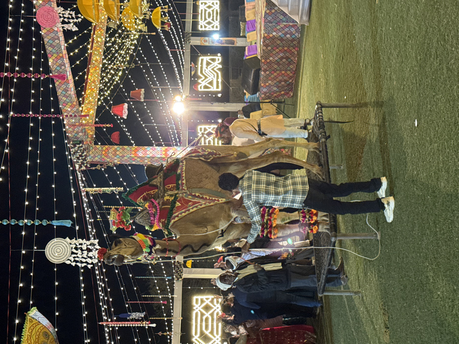A decorated camel stands prominently, surrounded by people