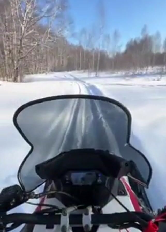 The video depicts a first-person perspective of riding a snowmobile through a snow-covered landscape