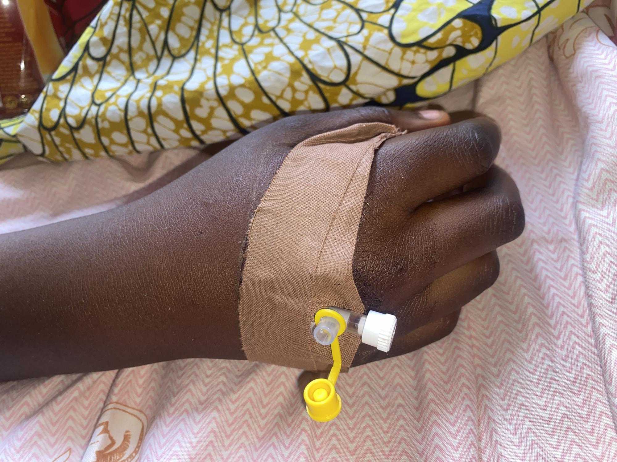 A person's dark-skinned hand, with an intravenous catheter inserted and secured with a beige bandage, rests on a bed covered with pink and white chevron-patterned sheets. The catheter has a white and yellow connector. A yellow and white patterned fabric is also visible on the bed. The image was captured in Rido, Nigeria.