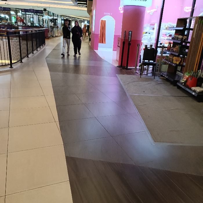 wide shot of a tiled floor in a shopping mall in Kecamatan Mijen, Indonesia, taken from the ground level looking straight ahead. The floor is composed of two types of tiles: light beige square tiles on the left and dark grey tiles on the right. The grey tiles are laid in a pattern of triangles. There is a slight ramp leading up to the dark grey tiles. The edge of the ramp is bordered with a grey tape. There are two people walking in the distance, both of them are wearing dark clothing. A small shop is on the right, with a pink storefront and a white curtain. There are shelves of products visible inside the shop, with various products and a few boxes on the shelves. There is a black chair with a black back and grey cushion placed in front of the shop and turned away from the camera. There are some black metal poles and a black metal railing in the distance. The railings are made of black metal bars, and they have a silver finish. They are attached to a black metal frame that is mounted to the wall.