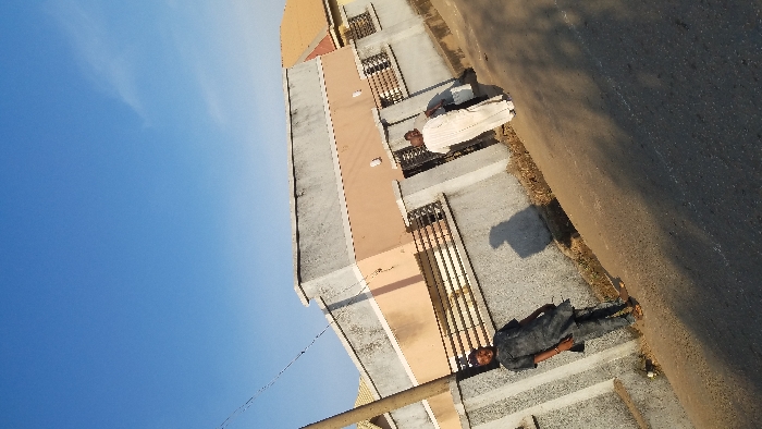 A building with a light gray roof and beige accents sits beside an asphalt road under a clear blue sky. Two individuals stand near the building; one wears a dark gray or black outfit, while the other is dressed in a white garment. Shadows are cast on the pavement near the figures, hinting at the sun's position. A pole and wires are visible in the foreground.