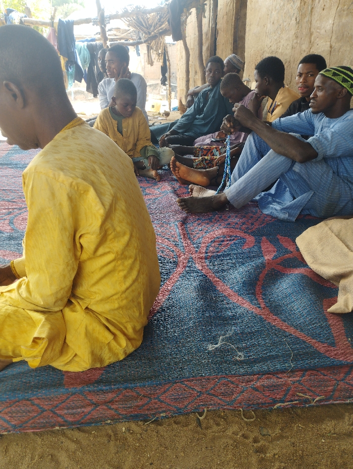 This image depicts a gathering of approximately eight individuals seated on a patterned mat within a semi-sheltered area in Pantame, Nigeria