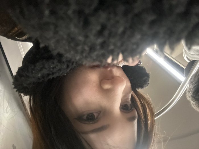 A woman looks up into the camera. She wears a fuzzy black hat. Her brown hair is visible around her face. The scene is lit with bright, harsh light, possibly from overhead fluorescent lights. The angle suggests the photo was taken from above. A metallic bar is visible in the background, implying she might be on a bus or train.