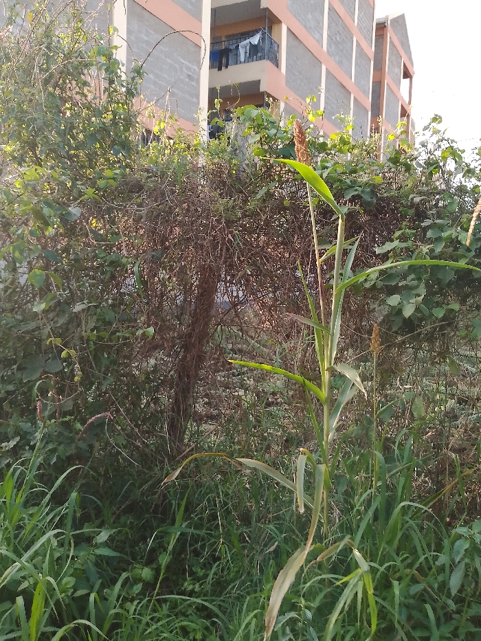 The image depicts an outdoor scene in Olkeri ward, Kenya, characterized by dense vegetation immediately adjacent to a multi-story residential building. In the foreground, tall green grasses and broad-leaved plants are prominent, with a singular stalk of a plant resembling sorghum or millet, complete with a brown, cylindrical seed head, centered and slightly to the right. Behind this, a thick, unkempt hedge composed of green foliage and dry, intertwining branches extends across the mid-ground. Sections of this hedge appear to contain integrated barbed wire. The background features a multi-story residential building constructed with visible grey concrete blocks and accented with light orange/peach trim around its structural elements. Multiple balconies are visible on the building; one on an upper floor displays various items of clothing hanging to dry on a line. No individuals, explicit actions, or interactions are present within the frame. The scene is illuminated by natural daylight.