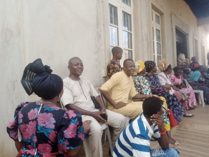 The image depicts an outdoor gathering of approximately 15-20 individuals, predominantly adults, situated against a light-colored building in the city of Nsugbe, Nigeria