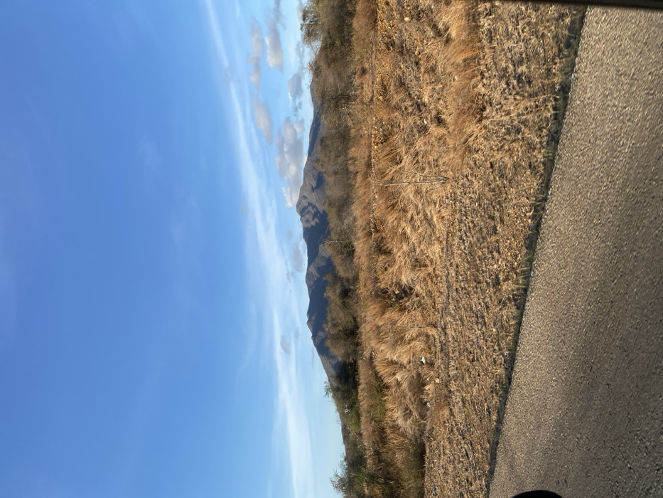 The image presents an outdoor landscape located in La Guardia, Venezuela, captured from the perspective of a vehicle. The scene is dominated by a clear, bright blue sky in the upper two-thirds, featuring scattered, thin white cirrus clouds and a few small, denser cumulus clouds near the horizon line above the mountains. In the background, a dark, undulating mountain range stretches horizontally across the frame, exhibiting rugged peaks and valleys. The mountains appear covered in sparse, dark-colored vegetation, contrasting with the sky. The midground is characterized by a wide expanse of dry, golden-brown to light brown grasses, varying in height and texture, suggesting arid conditions. Interspersed within this dry grass are numerous small to medium-sized shrubs and trees, many appearing dormant or having sparse, darker foliage. The ground beneath the vegetation consists of light brown soil mixed with small stones and rocks. Several small pieces of white debris are visible amongst the dry grasses in the midground. The foreground, occupying the lower left portion of the image, shows a section of a grey asphalt road. A dark, curved object, consistent with a vehicle's interior or exterior structure (such as an A-pillar or mirror housing), is visible at the extreme lower-left corner, confirming the photographic vantage point from within a vehicle. No people, animals, or specific actions are discernible in the scene. The overall lighting suggests a clear day, possibly late morning or early afternoon, with moderate shadows cast by the vegetation and mountains.