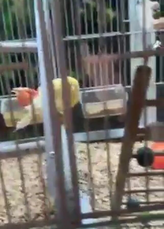 birdcage containing several small birds. The cage is rectangular and made of metal bars. Inside the cage, there are several birds with a mix of yellow, brown, and red feathers. The floor of the cage is covered in a light-colored bedding. There are also some toys and perches inside the cage. The camera moves around the cage, showing the birds from different angles. A person speaks Turkish.