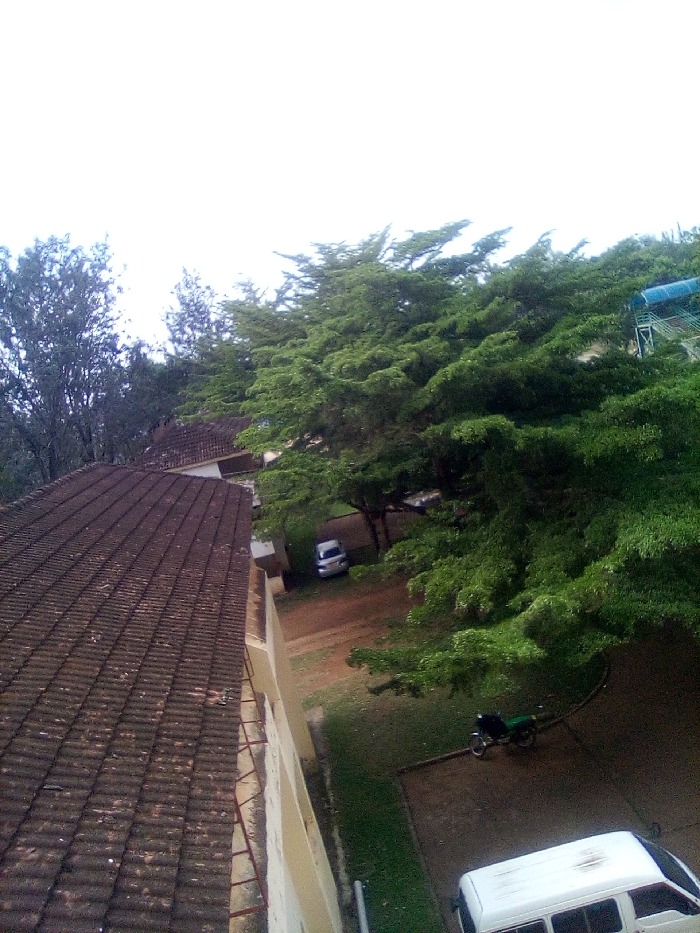 An elevated, downward-angled photograph depicts an outdoor scene in West Sakwa ward, Kenya, under an overcast sky. In the foreground, the dark brown tiled roof of a building extends diagonally from the lower left. Adjacent to this roof, a light-colored building wall, featuring a ladder-like structure, defines a courtyard or open area. Within this area, a light-colored sedan is parked on a reddish-brown dirt patch beneath a canopy of large, leafy green trees. A green and black motorcycle is positioned on a darker, possibly paved, surface next to a patch of grass. The front portion of a white van is visible in the lower right corner, also parked on a dark surface. Extensive green foliage, primarily large trees, dominates the right side and background of the image. A blue structural element, resembling part of a recreational slide or equipment, is visible above the trees in the upper right. The ground consists of a mix of reddish-brown dirt, green grass, and darker paved sections. No individuals are present; the scene is static.