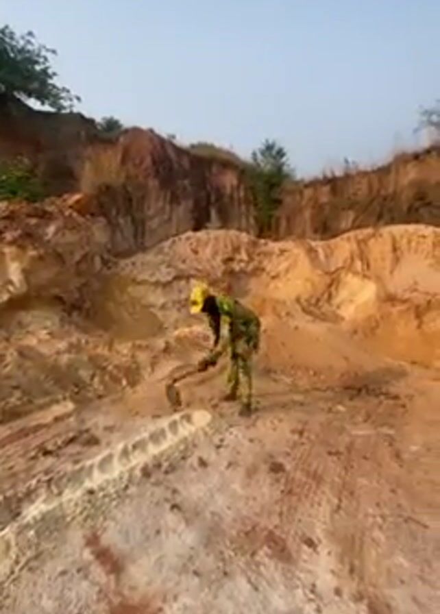 A person wearing a yellow hardhat and camouflage clothing is striking the ground repeatedly with a pickaxe. The setting is a large, open, sandy or muddy area, possibly a quarry or excavation site, with high dirt walls in the background. There are trees visible in the distance. The sky is clear.