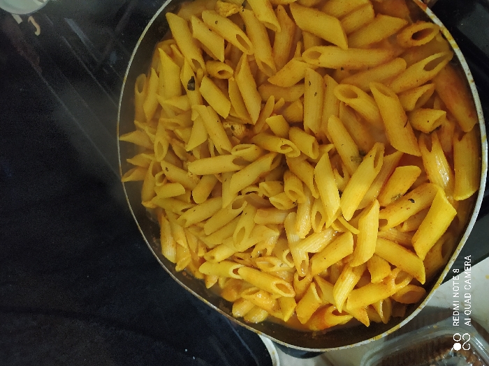 - "A top-down shot shows a pan filled with cooked penne pasta" by FM-AZF2o1, licensed under CC BY 4.0