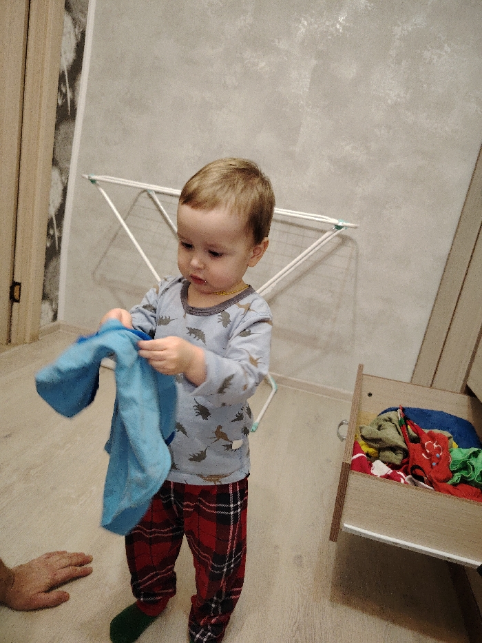 A toddler in a long-sleeved shirt with animal prints and plaid pants holds a blue garment. He stands in a room with a drying rack in the background and a partially open drawer to his right, filled with clothes. A human hand is visible in the lower left corner of the frame, resting on the floor. The scene captures a moment of domestic life, possibly involving laundry or dressing.