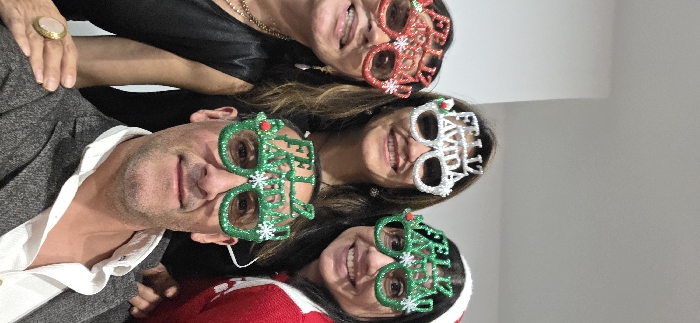 Four people pose closely together, wearing novelty glasses that read "Feliz Navidad" (Merry Christmas)