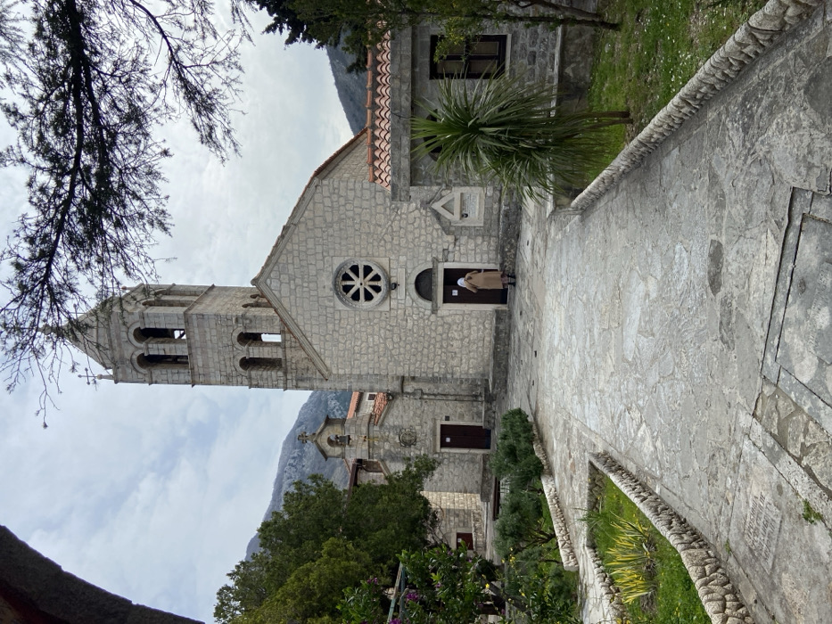The image depicts a stone monastery or church complex in Donji Katun, Montenegro, under an overcast sky