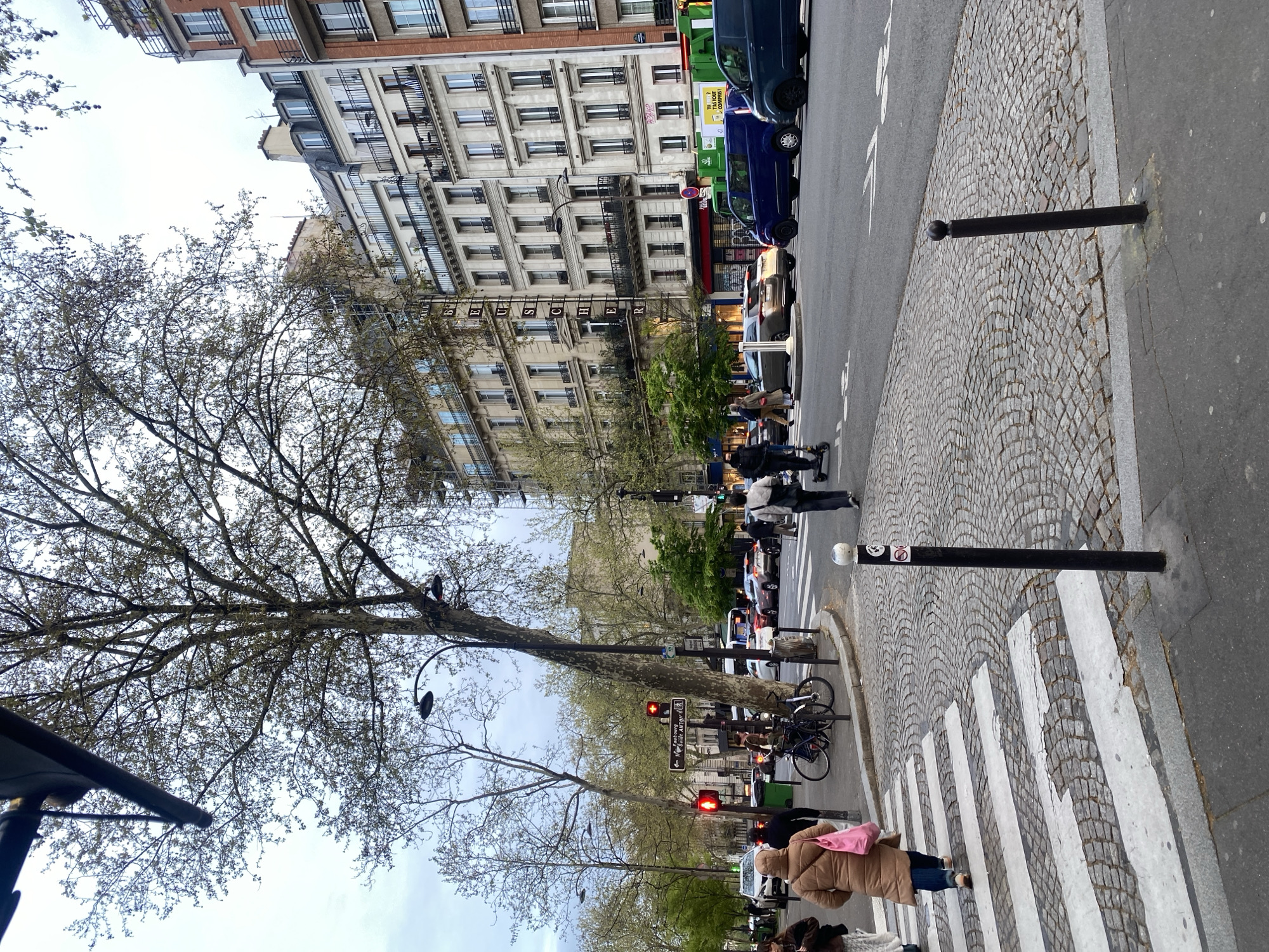 The image depicts an urban street scene at an intersection on Faubourg Saint Antoine in Paris, France, under an overcast, light blue-grey sky. In the foreground, a cobblestone-patterned street transitions into an asphalt road with a marked white-striped pedestrian crosswalk. A person wearing a brown coat and carrying a pink shoulder bag is visible from behind, walking across this crosswalk from left to right. Two black bollards with spherical tops are positioned along the edge of the pedestrian area. In the midground, a multi-lane intersection is active with vehicle and pedestrian traffic. A large, mature deciduous tree, exhibiting early spring foliage, stands centrally in the scene, next to a black streetlamp. Two bicycles are parked upright against the tree's base. Traffic lights are illuminated red, indicating a stop. Multiple vehicles, including a dark blue van, a black van, and several sedans of various colors (including silver and gold), are visible on the road, either stopped or in motion. One individual is actively riding an electric scooter across the intersection from left to right. A white street sign with black text points towards "Faubourg Saint Antoine" and displays a pedestrian symbol. The background is dominated by multi-story Haussmannian-style buildings, characteristic of Parisian architecture, lining both sides of the street. These buildings feature detailed facades, multiple windows, and balconies. Scaffolding is visible on the upper floors of one building on the right. Another building has a vertical sign spelling "BEAUSCHEL". Green municipal waste containers or a service vehicle with text "L'EST TOUT COMPRIS!" are partially visible on the right side of the street. Additional trees with sparse foliage line the distant street. Several other pedestrians are scattered throughout the scene, walking on sidewalks and crossing streets.