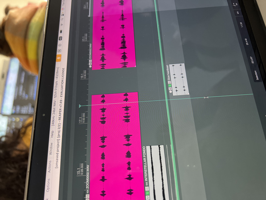 The image displays a close-up, angled view of a laptop screen running REAPER v7.49 audio editing software under an "Evaluation License." The screen shows multiple audio tracks; two prominent pink tracks labeled "ZOOM0002.WAV" exhibit distinct waveforms, indicative of spoken audio. Below these, a track labeled "INTERSTELLAR FONDO" and another labeled "Slow heartbeat" display their respective waveforms. A vertical green playback cursor is positioned near the 17.1-second mark on the timeline. The laptop's menu bar indicates "48kHz 24bit WAV" audio settings and a "Tue Oct" date fragment. A small webcam is centered on the top bezel. In the blurred background, the upper portion of two individuals is visible: one with dark hair closer to the foreground, and another behind, wearing a multi-colored garment featuring yellow, orange, and brown stripes or blocks. A second, distant laptop screen is also discernible in the background. The environment is an indoor setting, likely a classroom or workspace, given the presence of multiple individuals and laptops. The image provides no discernible visual information or specific contextual clues to establish its location within the city of Poitiers, France.