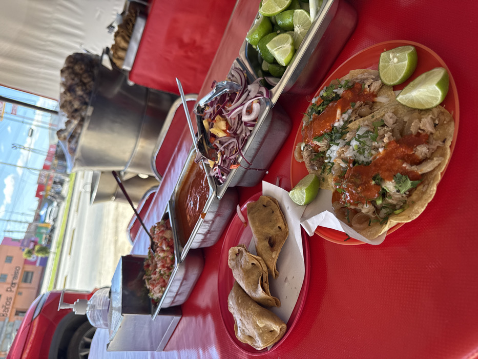 The image displays an outdoor street food stall operating on a red-covered table in Puebla City, Mexico. The background reveals a busy urban street with a multi-lane roadway, vehicles, utility poles, and commercial buildings. A prominent pink-hued building on the left side of the background bears the partial inscription "Baños Paraiso," indicating a location likely near 104 Poniente and 9 Norte. A white canvas awning partially covers the scene, under a bright, partly cloudy sky. In the foreground, two red plastic plates are visible. The plate on the left contains three golden-brown, deep-fried items resembling empanadas or quesadillas, resting on white paper. The plate on the right holds two tacos filled with light-colored meat, garnished with diced white onion, fresh cilantro, and a vibrant red salsa, accompanied by two quartered lime wedges. Adjacent to the plates, four stainless steel rectangular containers hold various condiments. From left to right, these include: a mixture of diced tomatoes, onions, and cilantro (pico de gallo) with a metal serving spoon; a smooth red chili sauce; thinly sliced red onions with other diced ingredients, alongside metal serving tongs; and a collection of quartered limes and chopped green onions. A clear bottle of hand sanitizer with a white pump dispenser is situated to the left of the first condiment container. In the midground, several large, stacked stainless steel pots, typical for cooking or keeping food warm, are visible. One pot is open, revealing chunks of cooked meat. A section of a red plastic chair back is present on the far right. No individuals are explicitly depicted, and no explicit actions or interactions are occurring within the frame.
