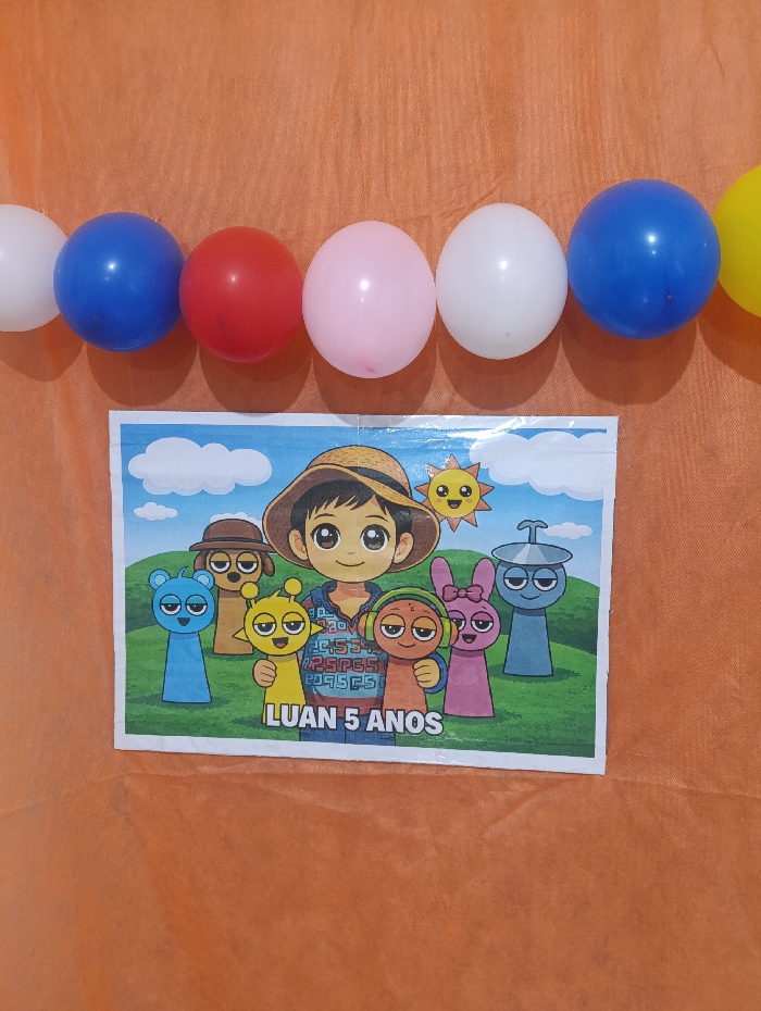 A vibrant orange backdrop is adorned with a string of balloons in white, blue, red, pink, white, blue, and yellow. Below the balloons is a printed poster featuring a cartoon character wearing a straw hat surrounded by animated creatures. Text on the poster reads "LUAN 5 ANOS". The background of the poster includes rolling green hills, a bright yellow sun, and fluffy white clouds.