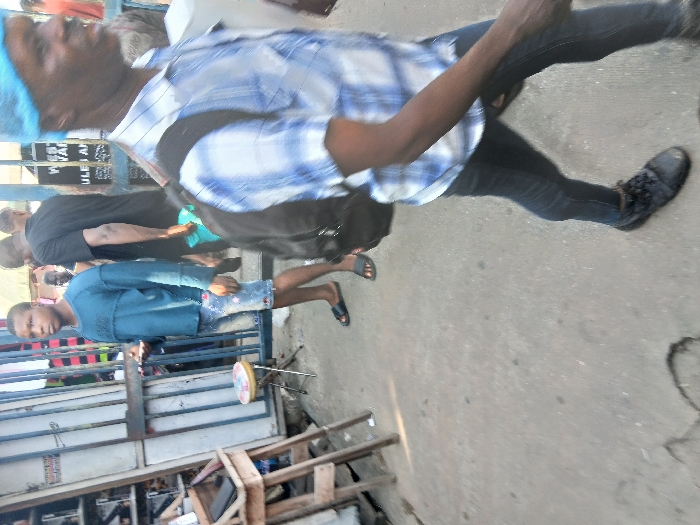 A busy street scene includes several people walking. One man wears a blue and white checkered shirt, dark jeans, and a blue cap. Another person is dressed in a blue shirt and denim shorts. Various structures are visible, including a metal fence, a wooden table, and other urban elements. The image appears to be taken from a slightly elevated and tilted perspective.