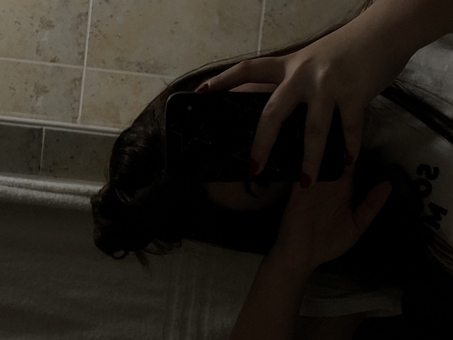 The image depicts a dimly lit mirror selfie of an individual's upper body