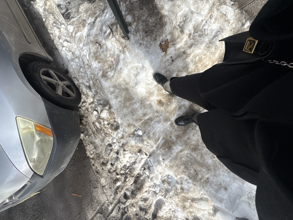 A silver car sits next to a slushy, snowy curb. A person wearing black pants, boots, and a black coat stands on the snow. A black handbag hangs from their shoulder, featuring a gold clasp and chain detail. A metal pole is visible in the background. The scene suggests winter conditions with melting snow and a mix of cleared and uncleared surfaces.