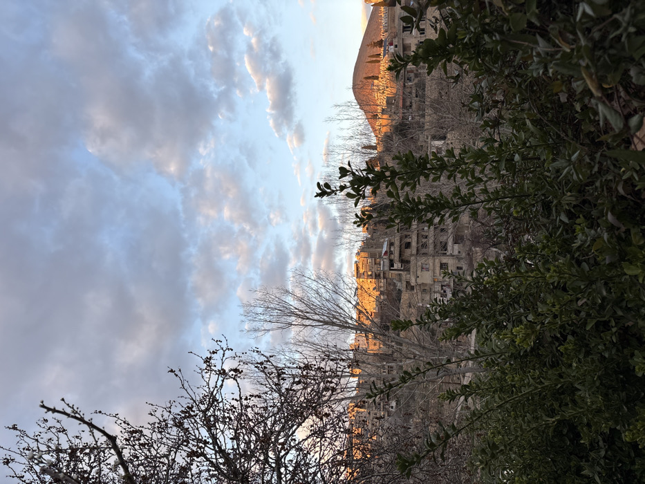 This image depicts an elevated view of a settlement identified as Munin, Syria, under a sky with scattered clouds illuminated by warm, golden light, suggesting either sunrise or sunset. The foreground is dominated by a dense arrangement of foliage, including bare tree branches on the left with small, dark pods or buds, and various dark green evergreen shrubs and bushes across the lower half, partially obscuring the view. In the midground, numerous multi-story buildings, consistent with residential structures, are densely packed and tiered across a hillside. Many of these structures, appearing to be constructed from stone or concrete, exhibit exposed facades and roofs, with significant portions bathed in the same golden light observed in the sky. Interspersed among these buildings are several bare deciduous trees. No individuals are visible, and no specific actions or interactions are depicted within the visible portions of the settlement. The background features a prominent, rounded hill or small mountain on the right, also illuminated by the golden light, especially on its upper slopes. A sparse line of dark, columnar trees, possibly cypress, is visible along the crest or upper part of this hill. The overall environment presents a static, architectural landscape during a period of dynamic natural light.