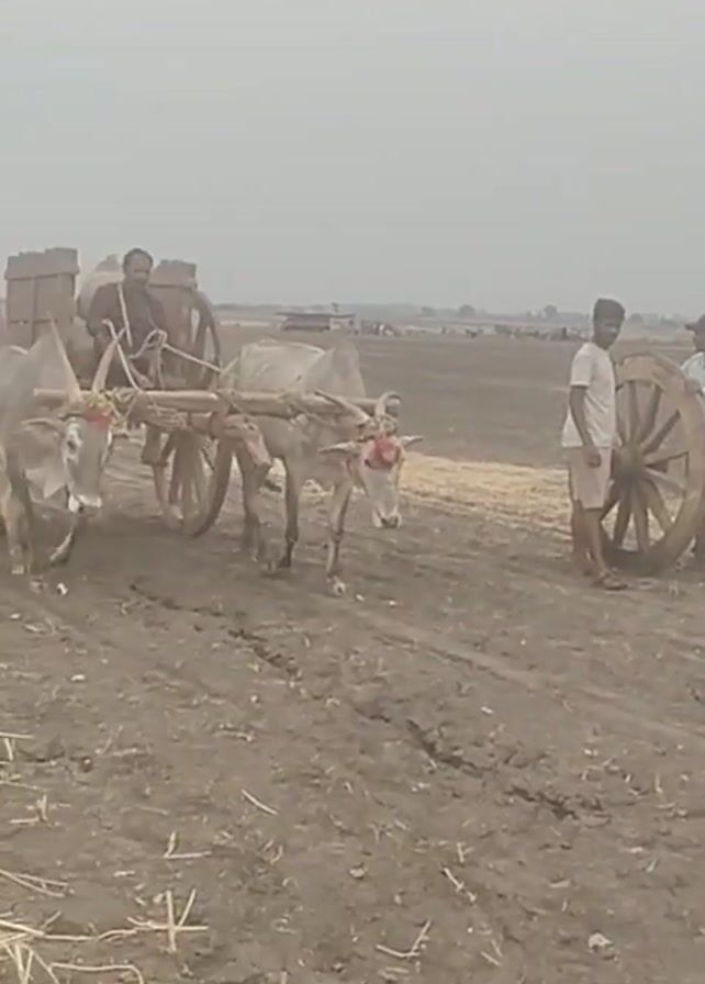 man driving an oxcart on a dirt field. The oxcart is pulled by two oxen adorned with headgear. In the background, two other men are standing next to a spare oxcart wheel. The field is dry and cracked, and the sky is overcast.