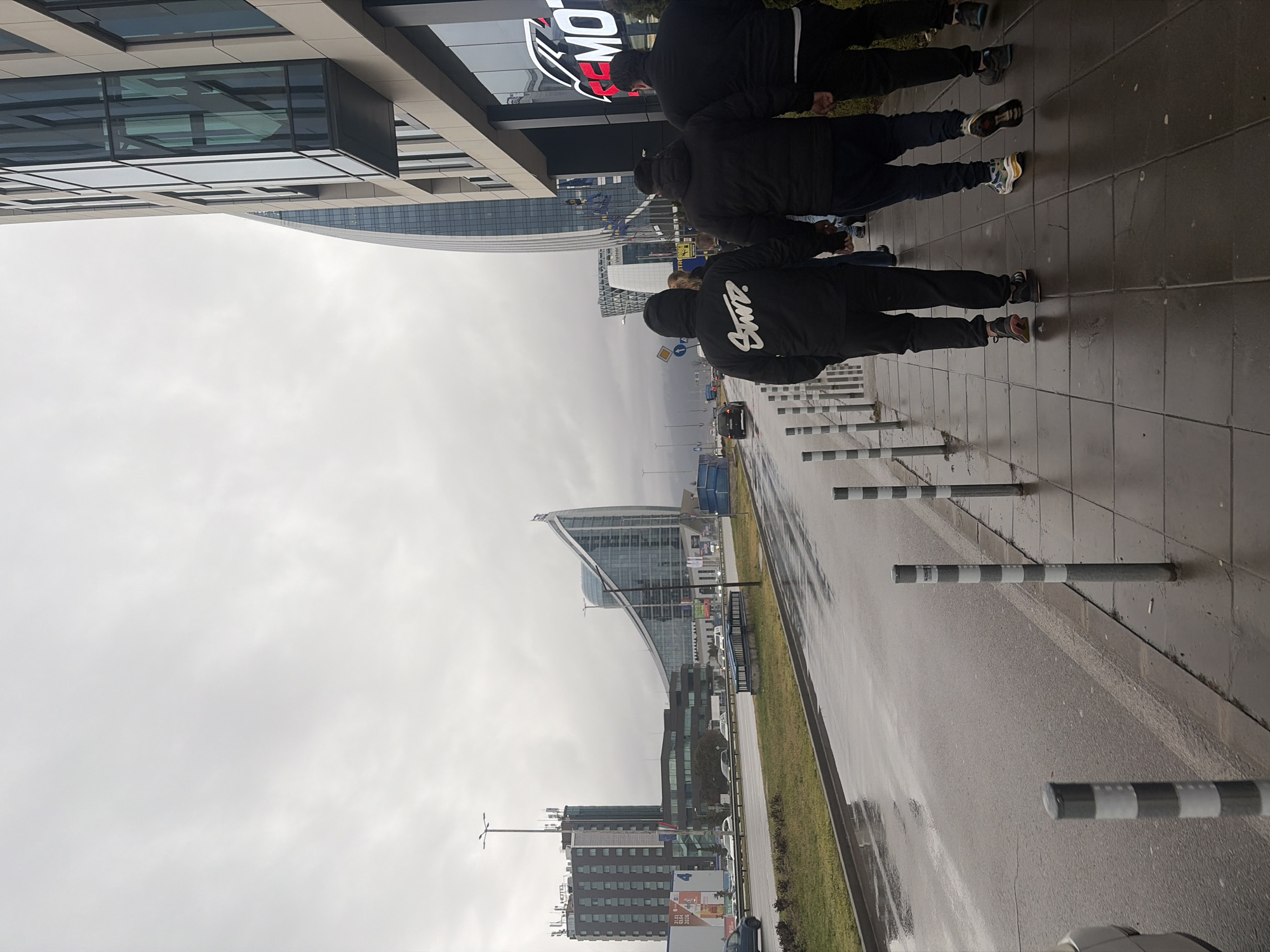 n urban scene on a rainy day. Four individuals wearing dark clothing are walking along a paved sidewalk adjacent to a street. Buildings with modern architecture are visible in the background. A sign with the word "REMO" is visible on one of the buildings. The location is Sofia, Bulgaria. Poles with alternating white and gray bands line the edge of the sidewalk. The sky is overcast.