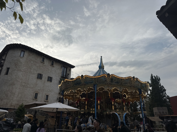 A carousel sits illuminated in front of a building with a tiled roof. The sky overhead is cloudy and overcast. The carousel is crowded with people. An open umbrella stands nearby. To the right, tall green trees provide a backdrop, along with a red building. The building on the left has several small windows.